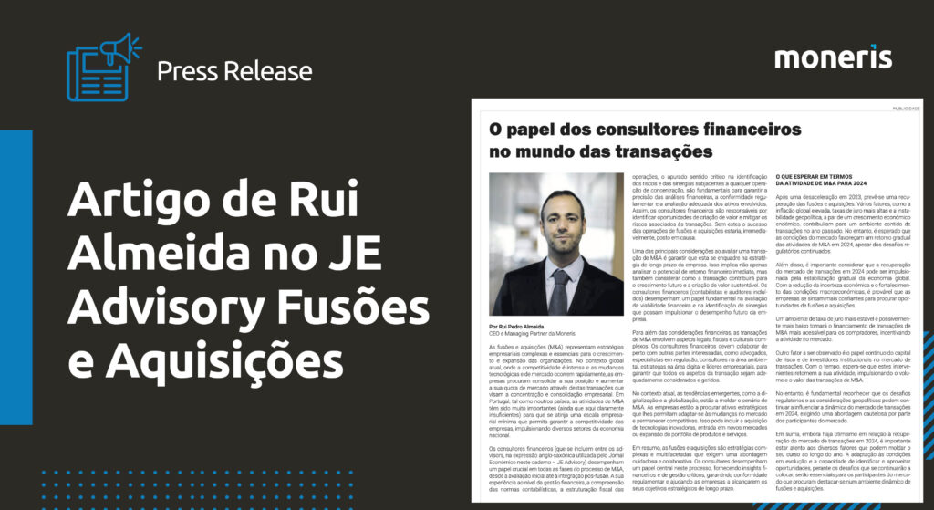 In this article, Rui Pedro Almeida, CEO and Mananging Partner at Moneris, highlights in this edition of the JE Advisory dedicated to the Mergers & Acquisitions sector, the crucial role that financial advisors play in mergers and acquisitions and outlines an outlook for the sector for 2024, where it underlines a recovery in M&A activities, as well as some regulatory and geopolitical challenges.